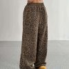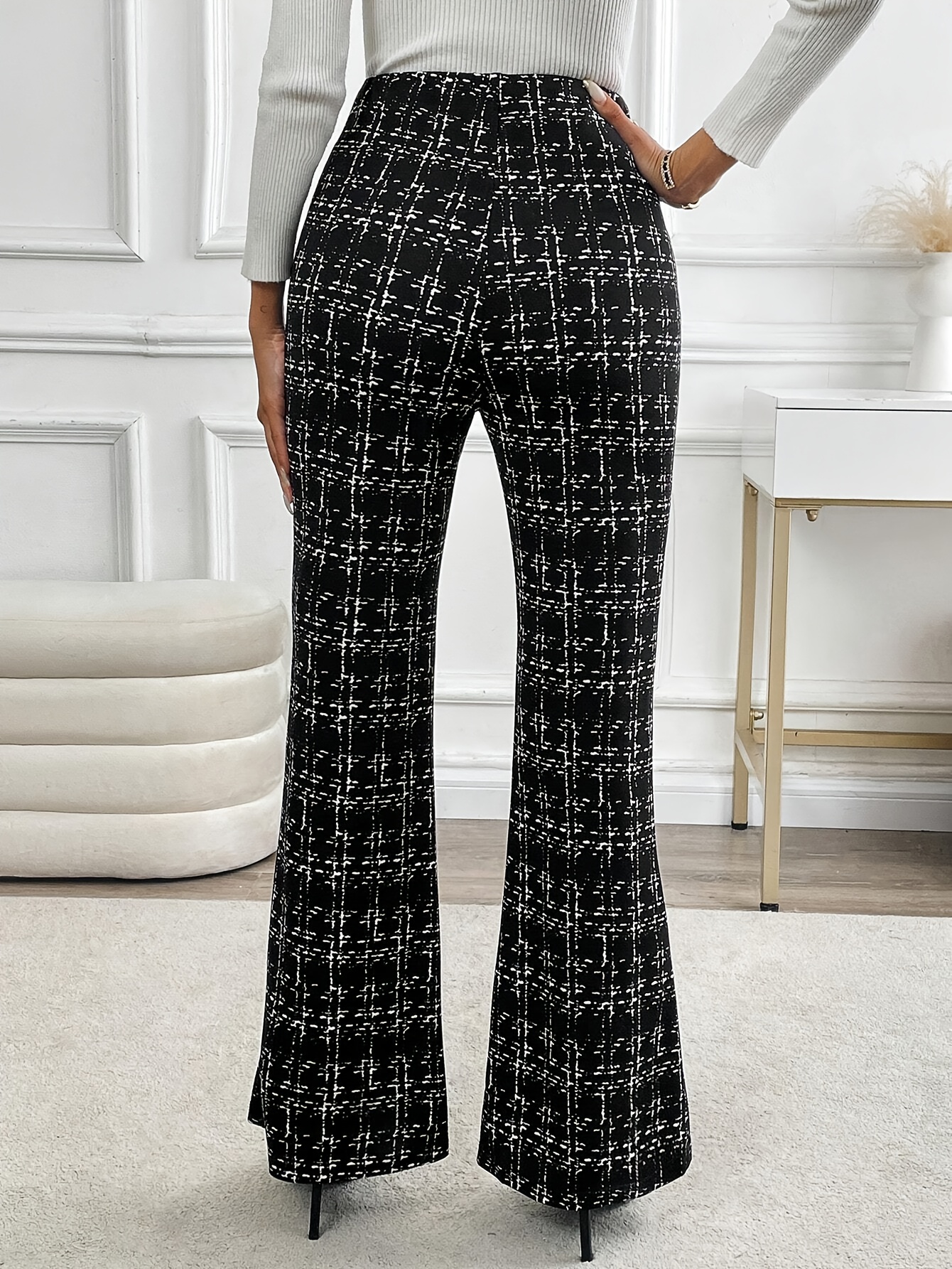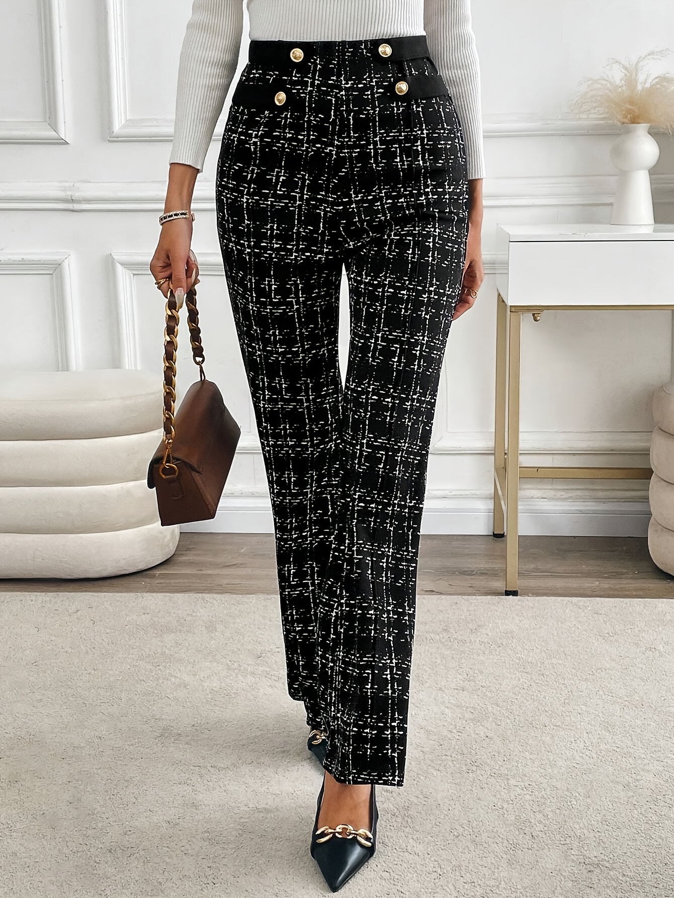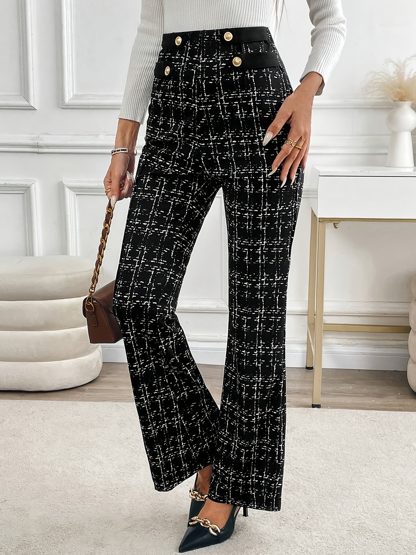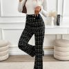 Elegant Polyester Flare Leg Pants for Women, 100% Polyester Knit Fabric, All-Season Long Length Trousers with Button Detail and Printed Pattern
